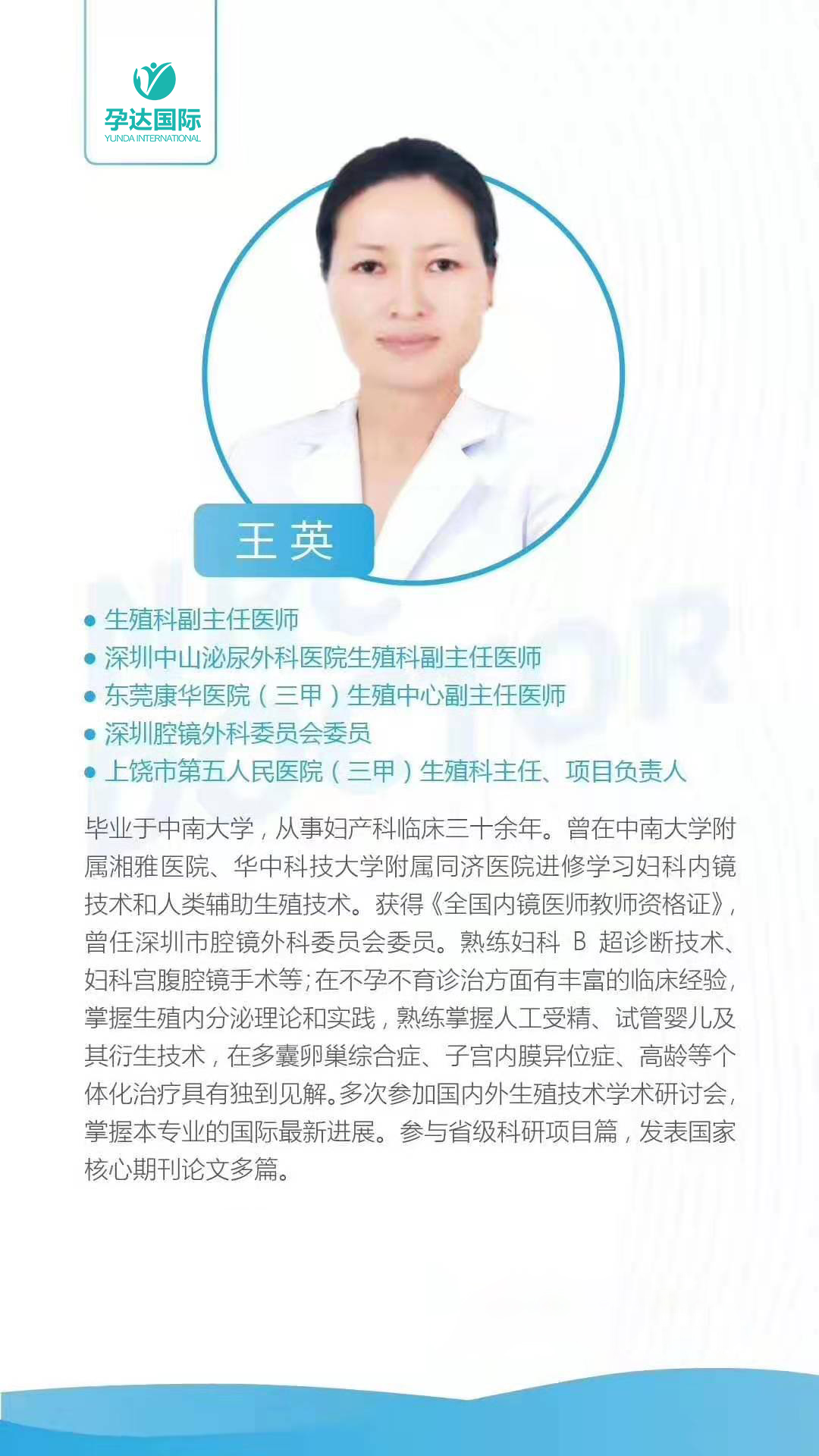 王英主任毕业于中南大学,从事临床30余年,无任何差错事故,无任何投诉,获得患者的信任、支持和追随。曾在中南大学复试湘雅医院、华中科技大学附属同济医院进修学习妇科内镜技术和人类辅助生殖技术。获得《全国内镜医师教师资格证》,曾任深圳市腔镜外科委员会委员。熟练掌握妇科B抄诊断技术、妇科宫腔镜手术等,在不孕不育诊治方面有丰富的临床经验。